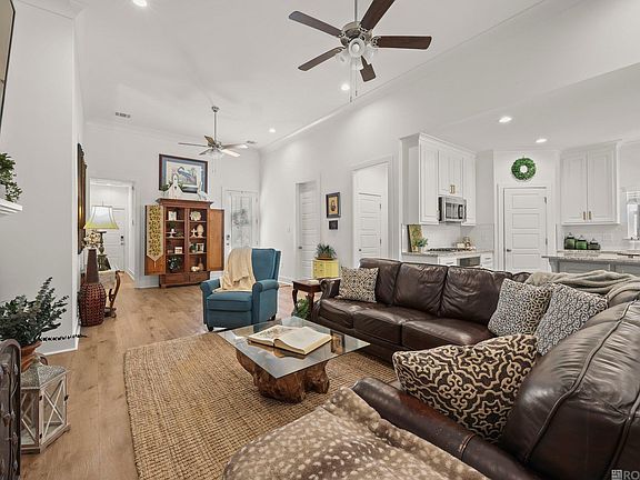 Better than new in unbeatable location in south Denham Springs! This 3BR/2 BA with additional dedicated office boasts a wide open kitchen and living area with soaring 12' high ceilings with moulding throughout. The gourmet kitchen features wall to ceiling cabinets, chef's island with drawer storage, seller upgraded decorative lighting and plumbing fixtures, GE stainless steel smart appliances, gas cooktop, soft close drawers and walk-in pantry. Private Master bedroom has en-suite bath which seller has also upgraded fixtures and installed a television for relaxing. Living room has a cozy gas insert fireplace and mantle. Seller even installed fireplace remote for easy use. 3cm granite counters throughout, LVP floors and oversized ceramic throughout the home--seller has also added ceiling fans in all rooms for convenience and matching LVP flooring in all bedrooms and closets--NO CARPET! Home has a full size utility room and private entrance from garage. Private courtyard style back porch with TV, mount and ceiling fan. Fenced-in backyard that backs up to woods for privacy. Enhanced Smart home security system with extra cameras surrounding the home, along with upgraded HVAC accessibilty through app. South Creek is located just across the street from Greystone Golf Community. Ride your golf cart over for dinner in the evenings at the Clubhouse or, the Clubhouse will deliver! This home is turn key and move in ready! Make your appointment to view today! Owner/Agent.