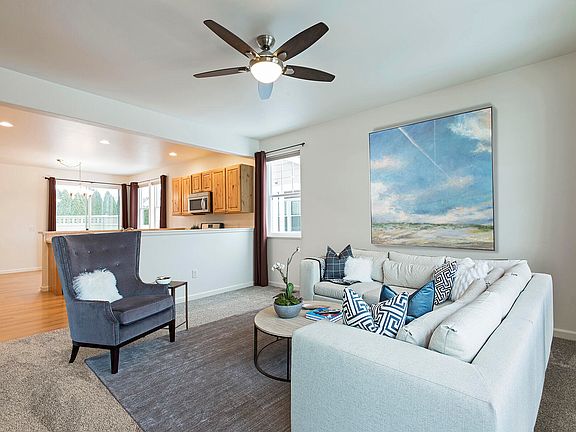 One Level Townhouse Living in Flynn Ranch! New carpet just installed in December 2022. A nice living room greets you when you walk into the home that is open to the kitchen that includes a stainless steel refrigerator, gas stove with microwave range hood, and dishwasher. The dining room features sliders to the back deck. The laundry room has a small counter area and access to the double garage. Down the hallway is a full bathroom with tile floors, two bedrooms, and a primary bedroom. The primary bedroom has an on suite bathroom with double sinks, shower, and a walk-in closet. The garage is finished and has a large separate storage area with shelving. Outside the lawn has UG sprinklers and raised flower beds. The yard is fenced and the back patio has a privacy fence around part of the deck.
