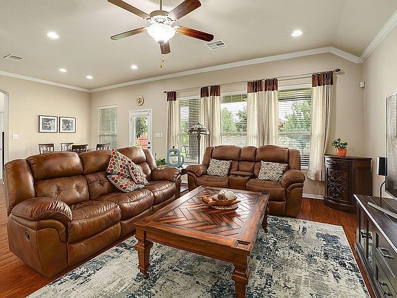 This beautiful home is meticulously maintained and move-in ready. Eucalyptus hardwood flooring was installed throughout the home in 2020. Ceramic tile is installed in all wet areas, and there is no carpeting in the home anywhere. The living area has bright windows looking out on the private backyard and covered back patio plus a beautiful fireplace, recessed lighting, and crown molding. The floor plan is open with the kitchen flowing into the breakfast area, living room, and formal dining area. The kitchen features granite countertops, stainless steel appliances, and a huge pantry with custom shelving. The formal dining room is large enough and could be turned into an office space or second living area if wanted. The owner's suite has a tray ceiling and large bay windows overlooking the back yard. The owner's bath has granite countertops, jetted tub, and separate shower. Secondary bedrooms all have walk-in closets, and the second bath is conveniently located next to all secondary bedrooms. There is a covered back patio that looks over the immaculate lawn and fruit-producing trees. Behrens Ranch Blvd. behind this home is a very low traffic area, and the rock wall at the back of the yard provides additional privacy. Other details: New roof shingles and lightning rods (2021), water heater (2021), and water softener (2021). Ring security system and doorbell; Rachio smart sprinkler system. There is extensive decked storage in the walkable attic and safe rack overhead storage shelving in the garage. The Behrens Ranch HOA features multiple swimming pools, tennis courts, community parks, and resident center. There is easy access to Old Settlers Blvd, putting you within minutes of extensive retail centers. Behrens Ranch feeds to Round Rock ISD and one of the best school paths in central Texas. Washer, Dryer and Refrigerator included. No smoking allowed. Tenant pays for all the utilities(Water, Gas, Electricity, Internet). Last month rent due at signing.