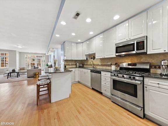 Heart of Lincoln Park extra spacious home (approximately 1,800 sqft.) with wide floorplan! The massive living & dining area along with open kitchen allows for a wonderful entertaining space. The white kitchen features a large island with granite & stainless appliances and plenty of cabinet space. Beautiful recently re-finished hardwood flooring is found throughout the home. The living room features a gas fireplace, french doors & plenty of room for over-sized furniture. The dining area comfortably affords a 10 person gathering table. In the rear you'll find a huge primary suite with two walk in closets. The primary bath features a whirlpool tub, dual vanity and separate shower. A separate utility room features a full sized laundry room with side by side washer and dryer. A sunny deck (21'x11') in the rear of the property & one dedicated garage space completes this special home in an amazing location close to the Lake, parks, DePaul, restaurants, bars and public transportation. Welcome home to Lincoln Park!