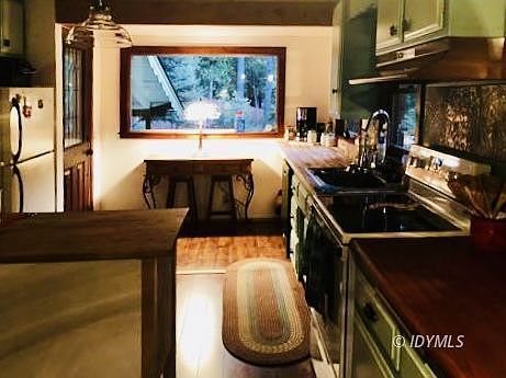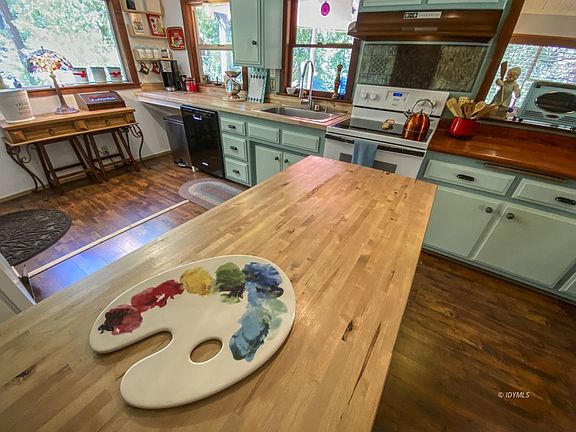 Long driveway leading to a beautiful midcentury cottage tucked back away from the street lends the feeling of privacy with a bird's nest view. This home was upgraded with lovely personal touches to be a forever home. The detailed upgrades can be noticed starting at the front entrance door. Craftsman doors, beautiful flooring throughout the main floor, carefully selected light fixtures, exposed beams, window trim both inside and outside. Windows throughout gives the home a surplus of ambient lighting, bringing nature indoors. Newer appliances in the kitchen. Dinning room with a outdoor sitting area. An office space off of the living room with a hidden door to a newly built laundry room. A hidden cellar trap door in the living room leading to an approximately 8x10 room for storage. The spacious guest bedroom on the main floor has an original built-in drawer system. Free-standing pellet stove gives off enough heat for the whole house. The spiral staircase leads to the second floor where the master suite is located. Bright and airy extra large bedroom includes a balcony with views of the tree-lines. 1-car carport with a storage unit. Extra storage space underneath the house.