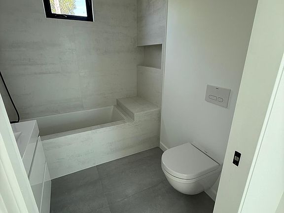 Stylish bathroom with floating vanity, rainfall shower, and a built-in bench for a spa-like experience
