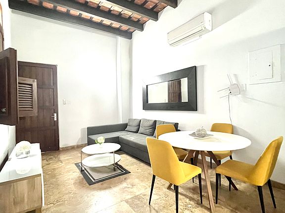 Modernly furnished 1 bedroom apartment with an ensuite bathroom and an upstairs mezzanine that can be used as an additional bedroom or an office space. Unit features beautiful high ceilings made of brick and wood, granite flooring, and a costume made kitchen with a full oven, microwave and refrigerator. There is a second half bathroom for guests and a laundry closet with a washer and dryer. The apartment is located on a small quite building in Old San Juan. The buidling has the advantage of an elevator that services each of its floors. Monthly Rent: $2k- utilities not included. 1st, Last Month's rent, Utility Deposit & Security Deposit are required upon signing of the lease. 12 months minimum term. On street parking. Available: Immediately. Call us for a video walkthrough of the unit and additional pictures. Private Showings: PR Real Estate Listings - A Smart Move! 1st, Last Month's rent & Security Deposit are required upon signing of the lease. 12 months minimum term.