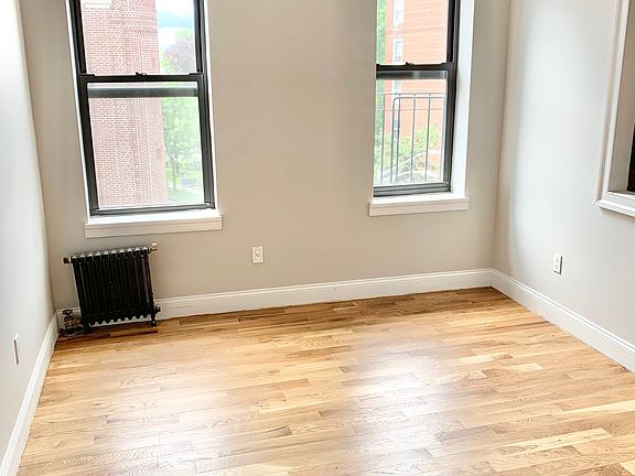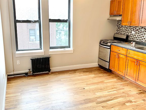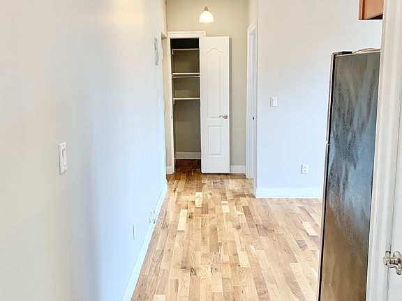 The apartment features a combined living room and kitchen, a king-size bedroom with a closet, a twin-size bedroom with a closet, 2 common area closets, and a renovated bathroom.