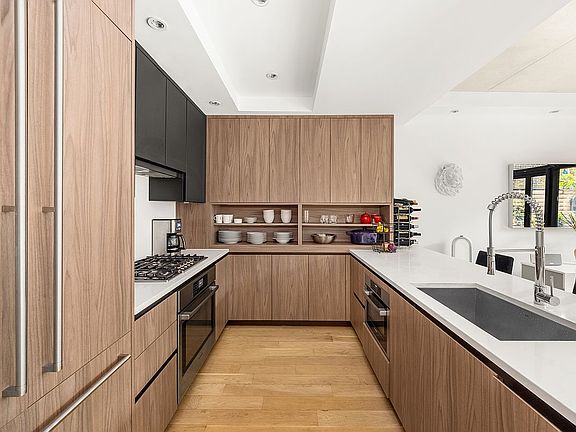 At its heart lies an expansive 550 sq. ft. private garden, professionally designed by Amber Freda. Once bare earth, the space has been transformed into a lush retreat that seamlessly extends into the neighboring community garden. Shade-tolerant plantings thrive here, complemented by a custom powder-coated pergola with integrated fan, a bluestone dining area, and a separate lounge anchored by a clean-burning fire pit. High-end outdoor furnishings-including a concrete dining table for six, bench seating, and a full suite of lounge furniture-are all included in the sale. For year-round enjoyment, the garden is outfitted with irrigation, uplighting, mosquito control, and retractable glass wall screens for seamless indoor-outdoor living.