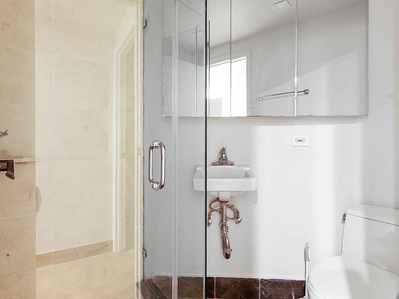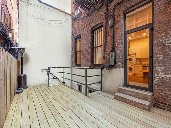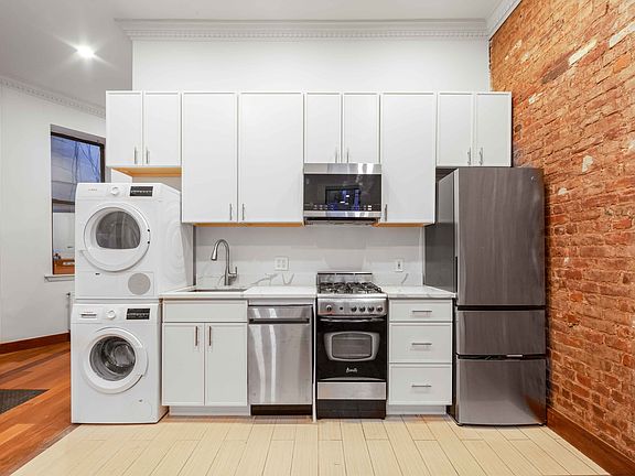 This spacious duplex boasts high ceilings and wooden floors throughout, plus beautiful exposed brick accents for added character. The huge living room opens to a modern kitchen equipped with full-size appliances, including a dishwasher.