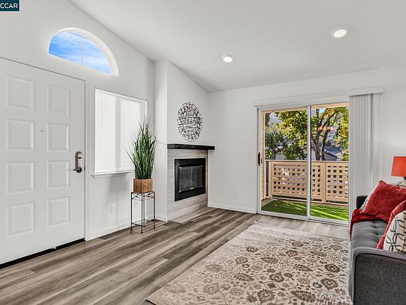 Gorgeous, move-in ready 2 BR/2 BA upstairs unit that is bright & airy. Fully remodeled in 2019 w/everything updated—new paint, vinyl laminate flooring, kitchen w/quartz counter, soft-close cabinets & stainless steel appliances, recessed lights, both bathrooms--even new doors. Enjoy a living rm that boasts a cozy gas fireplace for cold days/nights. Two private patios for morning coffee or evening dinners. Spacious primary bedroom en suite w/patio access, walk-in closet, bathroom with modern shower stall & dual sinks. Interior laundry closet—washer & dryer are included. Outdoor storage closet, detached one-car garage. Water heater replaced in 2025. You’ll love coming home to this secluded neighborhood nestled in the tranquil hills of Hercules. A community pool & clubhouse are available for your enjoyment during the warm months. HOA includes water, trash and exterior maintenance. Close to elementary, middle and high schools, parks and walking trails. So much offered at this affordable price! Must see!