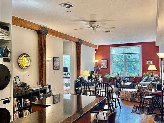 Welcome to the Chocolate Factory! The striking loft-inspired residence offers a flexible open design accentuated by oversized windows, soaring ceilings, & distinctive exposed brick & beams. The sleek kitchen provides an island/breakfast bar plus newer stainless steel appliances. Two well-proportioned bedrooms feature hardwood floors and excellent closet storage. Added conveniences include in-unit laundry, central air, and two garage parking. Residents have access to a large shared patio ideal for lounging and grilling, as well as a dedicated garden area.. Nestled on a quiet tree-lined street in lively Inman Square, there is easy access to countless cafes, dining options, and boutiques. Positioned between bustling Central and Union Squares, and only half a mile to the Red Line. Harvard & Kendall/MIT are within a one-mile distance. Walk Score is 93 & Bike Score is 99. Rent covers heat, hot water, gas, parking for 2 cars, bike storage, snow clearance & trash removal