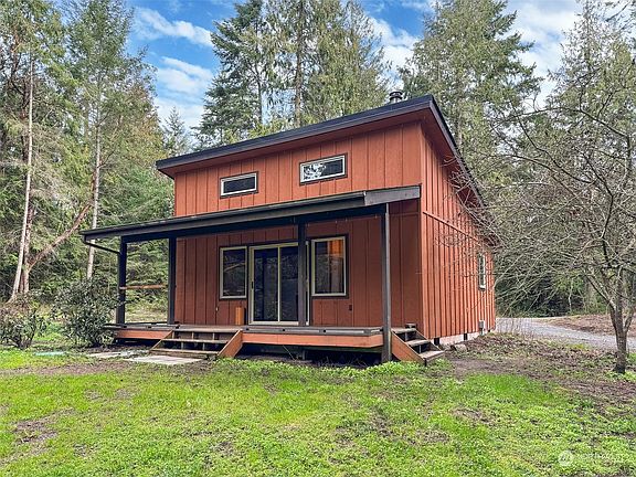 Quintessential cabin in the woods on 1.50 acres just minutes to town at the end of a private road. Rustic features such as vaulted tongue & groove wood ceiling, wood floors & extensive use of live edge wood accents. Ductless heat pump will heat & cool the home efficiently. Living room w/a wood stove. Dining area w/built-in office nook. Efficient galley kitchen, laundry/mud room w/tile floors & all appliances included. Bathroom w/a tub/shower combo w/a handheld shower head & plenty of shelves. Charming covered front deck w/bar. 1 car detached garage w/power, garden shed, 2 cherry trees, room for a garden, firepit, circular driveway & ample parking for your RV, boat, etc. Plenty of cleared area for natural light with a treed perimeter.
