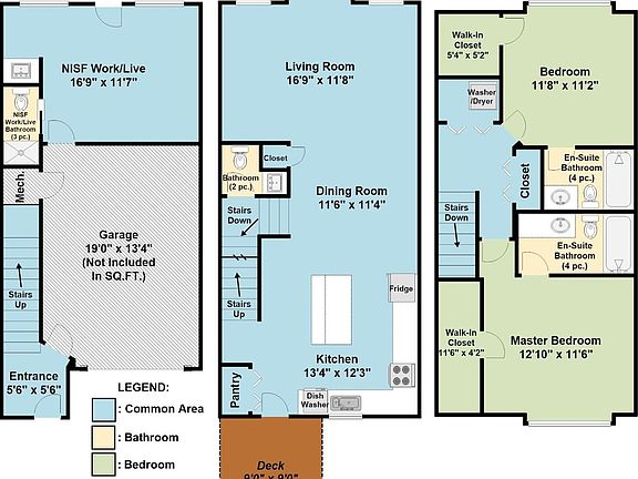 Welcome to an attractive townhome located in one of Nanaimo’s rapidly developing areas. The unique floor plan offers a ground-level entry with a single-car garage and a versatile live/work space featuring its own entrance and bathroom — perfect for a home office, guest suite, or additional family room. All on the lower floor. Upstairs to the middle floor, enjoy a bright, open-concept living area with abundant natural light and a spacious kitchen boasting custom cabinetry and elegant quartz countertops. There is a balcony off of the kitchen with a tiny ocean view. The top floor offers two large bedrooms, each with its own beautifully finished ensuite for ultimate comfort and privacy and each with a walk-in closet. The laundry is also on this floor. This stylish, flexible home truly offers the best of modern living. All measurements are approximate and should be verified if important. Tenant pays 2800/m and would like to stay. Options to keep the live/work space for your own use.