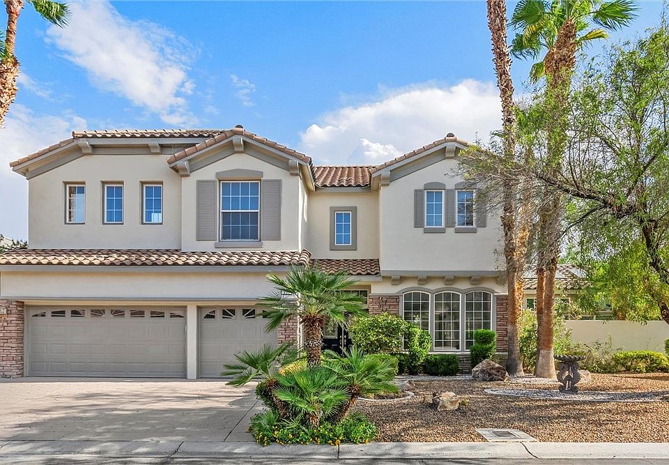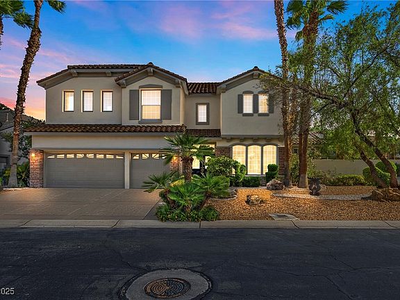 Exquisite guard-gated custom estate offering luxury, privacy, security, and prime location—just blocks from the Las Vegas Strip. This 4,549 SF two-story residence features 5 bedrooms, 4 full baths, an office/library, sunroom, and a media room on a corner lot. The open floor plan boasts vaulted ceilings, a chef’s kitchen with granite counters, stainless steel appliances, and a large island with breakfast bar, seamlessly flowing to a family room with surround sound and built-in entertainment center. The primary suite showcases a double-sided fireplace, spa-inspired bath, and walk-in closets, while secondary bedrooms offer generous storage. Enjoy movie nights in the media room or unwind in the tropical backyard oasis featuring a Pebble Tec pool, waterfall, heated spa, and lush landscaping. A finished 3-car garage with epoxy floors and a central vacuum system completes this stunning home—minutes from Allegiant Stadium, the airport, restaurants, and world-class shopping.