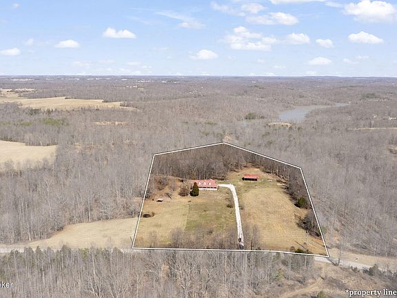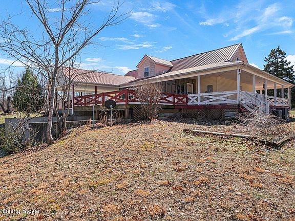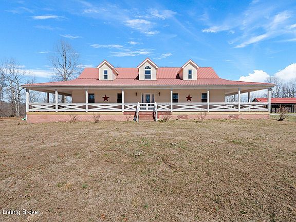 Beautiful home near Nolin Lake on 7.5 acres! This home has such charm with the setting and wraparound porch. The main floor has everything you need for primary living, complete with laundry room, half bathroom, primary bedroom suite, separate dining room, foyer, 2 car covered parking, and open kitchen/living room. Up the partially open staircase are two large bedrooms with walk-in closets, bonus room, and full bathroom. All this is over a full, walkout basement with a huge 2 car garage, kitchenette, full bathroom, and family room. The outside is ideal for a mini farm, with a couple pasture areas and an open barn with a couple stalls. Nolin Lake is very close, as well as area restaurants.