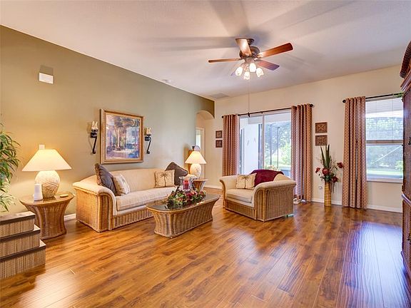 NEW TO THE MARKET: ROOF 2022. HVAC 2025. This 2,489 sqft, well-maintained 2 Bedroom, 2 Bath, split-floor plan home, with a large Den (24'x14'), has much to appreciate. On a corner lot, the mature landscaping, paver driveway and walkway (2024), lends to an appealing first impression, along with the oversized two-car Garage (25'x22'), with an attached Golf Cart Garage (8'x10'). As you enter through the screened-in alcove, and through the front leaded-glass door, you’ll immediately appreciate the comfortable environment created by the neutral tones and abundance of natural light provided by the glass sliding doors and windows in the Living Room and Dining Room. This expansive floorplan features an open Kitchen Island with sink and breakfast bar seating, double-door Pantry, and allows for a comfortable flow to the Family Room (18'x15). From the Living Room, sliding glass doors allow for access to the standout feature of this home, an expansive covered and screened Lanai (21’x24'), while the tall mature rear landscaping offers much PRIVACY. Glass sliding doors that also allow access from the Primary Bedroom and Family Room. The large Primary Bedroom has two walk-in closets & an over-sized Ensuite Bathroom. The presence of sidewalks adds to the ease of navigating the neighborhood. The Plantation at Leesburg is a private, access controlled, 55+ community that enjoys a low monthly HOA fee, two 18-hole golf courses, practice range, pro-shop, restaurant, pickleball courts, 3 pools, 3 club houses, fitness facilities, fishing pier, secure RV & boat storage, and many more amenities. Close to shopping, medical facilities and main roads. Equal Opportunity Housing. EASY TO SHOW.