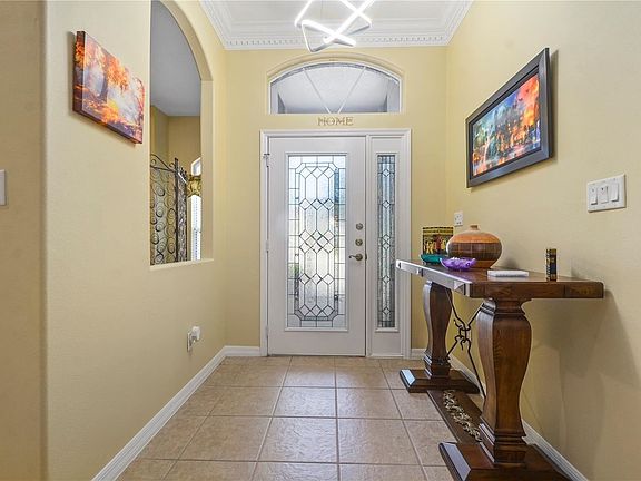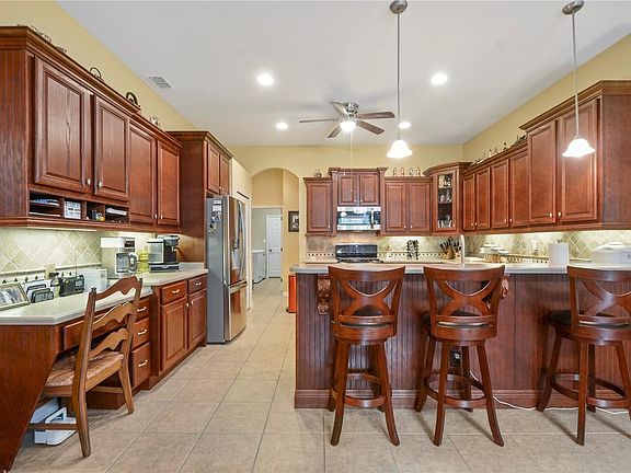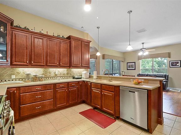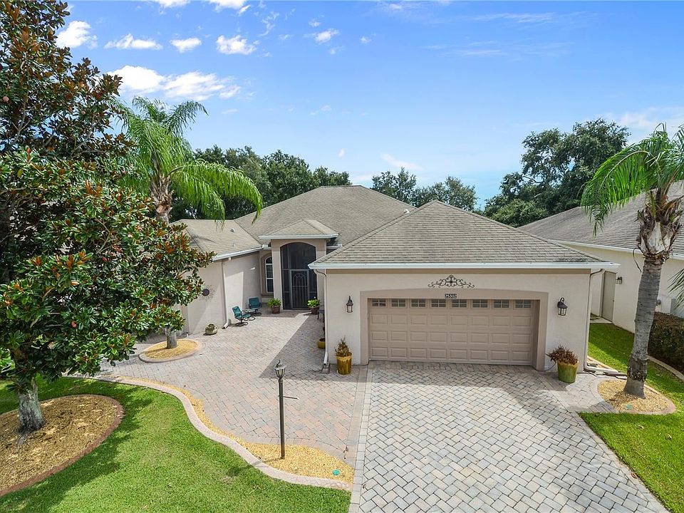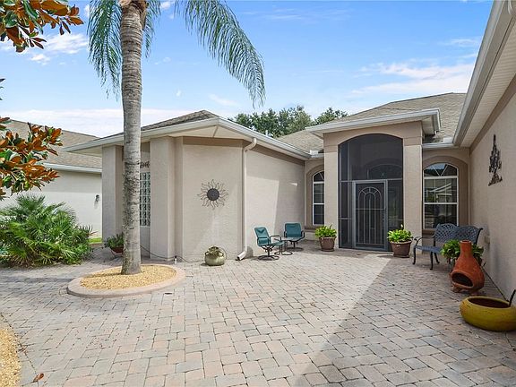 Welcome to the Plantation at Leesburg, a sought after 55 plus golf community! This popular Pandorea model features 3 bedrooms, 2.5 bathrooms, plus an office, and it is just under 2700 square feet of living space! You will love the open floor plan that you'll notice as you enter the beveled glass front door. There is a formal dining room to the right and the office with double doors to the left. Continue to the formal living room where you will notice the detailed crown molding, wood floors, and sliding glass doors that lead out the lanai. The family room features wood floors and sliding doors that also lead to the lanai. The kitchen is magnificent with the propane gas range, 42 inch cabinets, travertine backsplash, built in desk and upgraded appliances! The secondary bedrooms and second full bath are off the family room/kitchen area. The master bedroom suite is spacious with 2 newly installed custom designed closets! There is plenty of space in the master bath! The screened lanai has pavers and lots of privacy! A great place to relax and enjoy the outdoors! The recent upgrades include motorized remote controlled shades on the sliding doors and several windows, new upgraded screens on the lanai and at the front entryway, replaced mulch with river rocks and replaced some decorative curbing, upgraded landscaping, and more! The garage has a 9x8 ft. golf cart parking area! The community has great amenities including 3 pools, 2 golf courses, restaurant, lounge, pickle ball, tennis, and more! Hurry to see this beautiful home because it won't last long! Boat and RV parking available for additional fee.