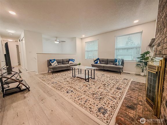 Beautifully updated home with modern finishes! Cheery kitchen with new appliances, quartz countertops and open layout to dining room with deck access. Features three spacious bedrooms including the primary suite with private bath and a second full guest bath. Fully finished lower level offers a large family room with second fireplace and insert, laundry area and half bath. Step out onto the lower patio and enjoy the views! Updates include new flooring, lighting, remodeled bathrooms with new tubs and toiletes, new windows and blinds and fresh paint inside and out. Move-in ready and filled with modern style- a must-see! Centrally located enjoy easy access to Kent, minutes to Kent Station and Sounder Train.