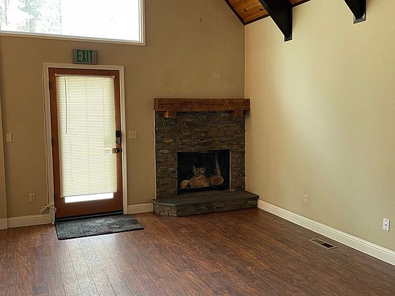 Laminate flooring in the main living and kitchen areas plus loft, and new carpet in the bedrooms. Open concept kitchen, and living room with fireplace, expansive ceilings and forest views all around. The large bedroom upstairs also has a gas fireplace and vaulted ceilings. There is also a large sunny deck across the front of the property. Washer/dryer hook-ups are located in the garage.