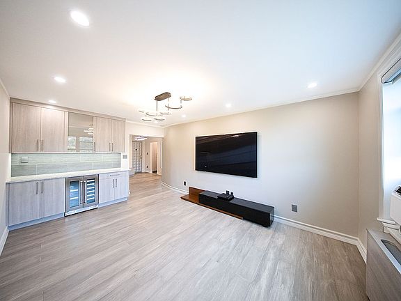 Living room adds a built-in bar with beverage center, wall-to-ceiling cabinetry with bench, and an 85"