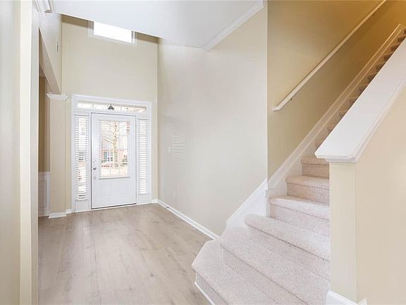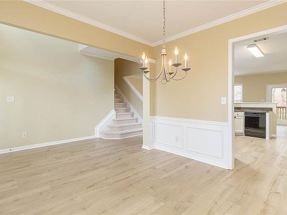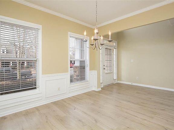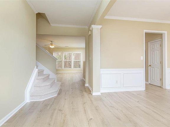 NEVER leased before! Wide-plank laminate flooring on ENTIRE main level. Rock chair front porch leads to two-story foyer flanked by formal dining room. White island eat-in kitchen views the fireside great room. FRIDGE included. Deck overlooks, private, wooded level backyard. Guest bedroom or study on main. Upstairs laundry. Vaulted master w/new laminate in bath. 3 additional secondary bedrooms up. Lease includes Trash service and use of Swim/Tennis.