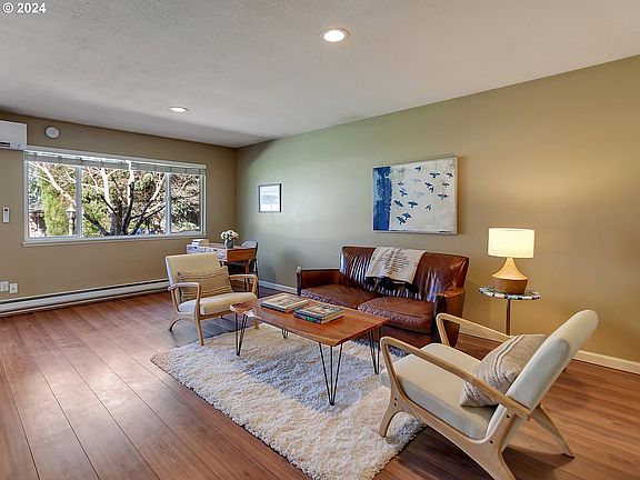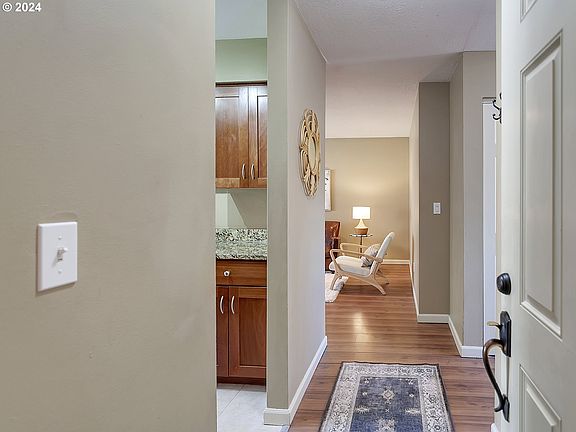 Welcome to Crestview Terrace, a well-maintained gem hidden in Multnomah Village. The community centers on a well-kept green and includes a nicely designed wooded area around the parking lot and is near groceries, restaurants, and shops. Number Sixteen feels more like a cottage than a condo. The home has a separate roof from the end unit below it and shares a short wall on the opposite side. An entry hall brings us to a kitchen with granite counters and stainless appliances before opening to the dining area and expansive living room. The sliding glass door faces a paved and fenced-in patio with room for a table and chairs and a potted garden. A newer split system provides heat and air conditioning. The laundry is tucked into the hallway, which leads to the full bath with a shower over the tub. On the backside of the house sit two nicely sized bedrooms. The king-sized primary bedroom is large enough for multiple dressers or a workspace and includes a fitted walk-in closet and a half bath. The second bedroom easily fits a queen set and has a double closet with sliding doors. Below the unit is a basement with a storage space. The stairs are just outside the door to the home. Parking spot N is allotted to Number Sixteen. Guest parking and street parking are allowed. The building fees include management, water, sewer, garbage, insurance, exterior and common area maintenance.