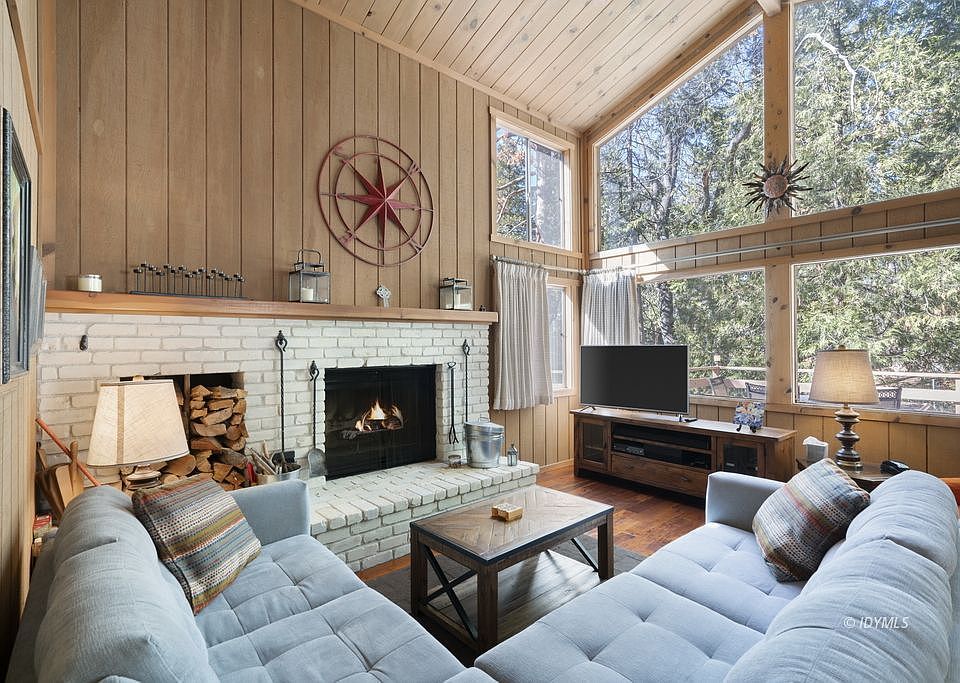 Well-Maintained 3BD/2 Bath with Large Finished Attic: Located high up in the Pine Cove area of Idyllwild is this unassuming yet charming mountain cabin. Lovingly maintained and having only two owners in the last 45 years, this 1790 sq. ft. 3-bedroom 2-bath home has a generous size kitchen with a laundry area and plenty of storage. It features thoughtful upgrades like engineered hardwood floors, exterior grade sheathing on the walls and a new propane FAU. The large, inviting living room showcases soaring high knotty-pine ceilings, beautiful light-spilling windows, and a picture-perfect brick fireplace complete with a built-in bench and wood storage. As you enter the hallway, pull down the sturdy ladder steps that lead you upstairs to a finished attic with the potential to be an additional family room, office, or studio. The main floor has two guest bedrooms, a separate full bathroom, and a spacious primary bedroom with vaulted, knotty pine ceilings, gorgeous wood beam detail, and an ensuite bathroom. Adjacent to the dining area is a large deck providing outdoor living space, allowing guests to meander outside to experience the pines with ease.