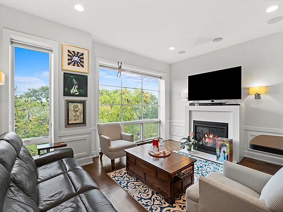 Welcome to this breathtaking, move-in ready 2 bedroom, 2 bath penthouse home in the highly sought-after North Center neighborhood. Boasting a contemporary design with exquisite details, this home offers a perfect blend of luxury, style, and comfort. Step inside and be captivated by the hardwood floors and floor-to-ceiling windows, flooding the space with natural light. The elegant wainscoting adds a touch of sophistication throughout, while the spacious living room showcases 10' ceilings and a cozy gas fireplace-the perfect spot to unwind while enjoying stunning views of Revere Park and the Chicago Skyline. The gourmet kitchen is a chef's dream, featuring sleek white cabinetry with under-cabinet lighting, quartz countertops, a stylish marble backsplash, and premium Bosch stainless steel appliances. The custom range hood and wine fridge add extra touches of luxury to this thoughtfully designed space. Just a few steps down, you'll find the tranquil primary bedroom suite, offering a generous walk-in closet, a spa-like ensuite bath with a whirlpool tub, a spacious shower, and a double vanity. Your own private balcony completes the retreat, making it the perfect place to relax. The unit also offers a spacious second bedroom, an additional full bath, convenient in-unit storage and recessed lighting throughout. The brand-new Electrolux washer/dryer makes laundry a breeze. One of the many perks of this home is the garage parking that comes with the unit. Plus, enjoy the building's large rooftop deck over the garage. Located within the acclaimed Coonley School District, this home is perfectly situated just steps away from the bike path extension, Chicago River, Horner Park, California Park, McFetridge Sports Center, and more! This is North Center living at its finest. Schedule your showing today and make this stunning penthouse your new home!