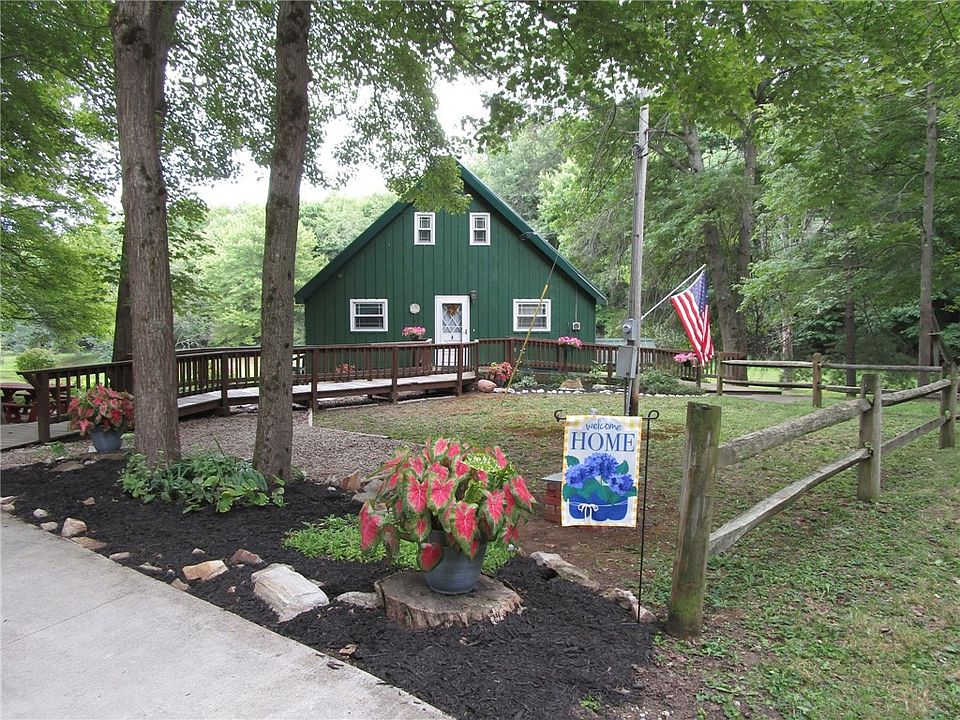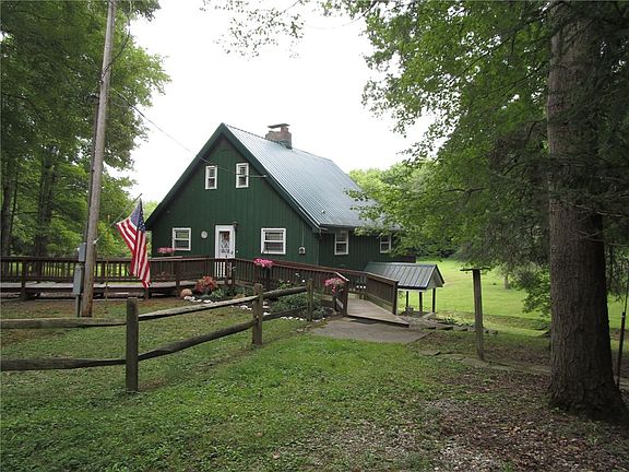 Stunning Setting for this 3 Bedroom, 2 Bath A-Frame! Long Driveway Leads to Private 6.7 Acres with Pond, Large Outbuilding and 2 Car Garage with 780 s.f. Loft with Electric Baseboard Heat. Brick Woodburning Fireplaces Grace the Large Living and Family Room. Nice Deck Off Back of the House to Take In the Scenery. Update and Make this Home Your Own!