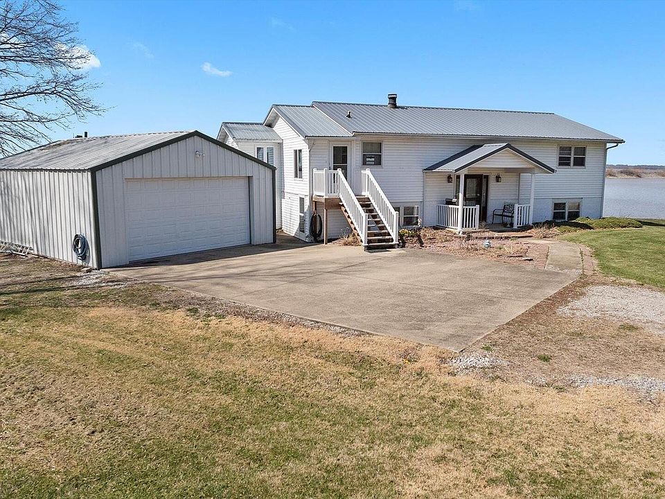 This stunning 3-bedroom, 3-bathroom lakefront home offers breathtaking panoramic views, best enjoyed from the spacious sunroom that floods the home with natural light. The beautifully updated kitchen boasts sleek stainless steel appliances, ample counter space, and a large pantry for all your storage needs. Outside, a 24x30 detached garage provides plenty of room for vehicles and storage, while an 18x18 shop is perfect for hobbies, projects, or additional workspace. Whether you're relaxing by the water, enjoying the view from the sunroom, or taking advantage of the ample storage and workspace, this home is a perfect retreat for lakefront living! Detached Building roof is new. Aeration - serviced annually. Seller treats monthly with bacteria pucks. Furnace is new, A/C approximately 8 years old.