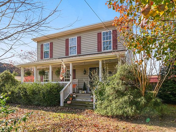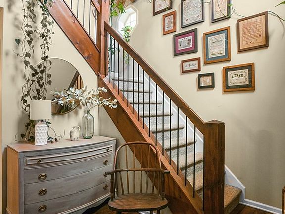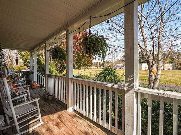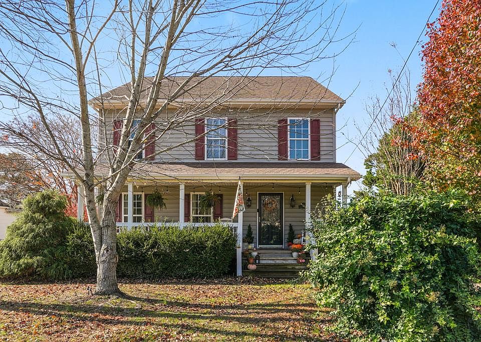 Inviting colonial on a quiet dead-end street, featuring a wide covered front porch and open two-story foyer with hardwoods throughout the main level. The living room boasts a large brick fireplace with hearth and mantle, creating a warm focal point, and flows into the dining area and kitchen with rich wood cabinetry, recessed lighting, and well-designed spaces for cooking and entertaining. Main-level primary suite includes a walk-in closet and ensuite bath with jetted tub and separate shower. Spacious laundry/mudroom adds convenience. Upstairs offers a large loft, two bedrooms, a bonus room, and two full baths. Backyard is dotted with mature trees, features a fire pit, and includes two outbuildings, including a barn-style shed ideal for storage or workshop use. Beautifully maintained home!