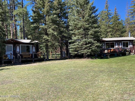 TWO COZY CABINS CAN BE OWNER OCCUPIED OR RENT ONE OUT AS VACATION OR FULL-TIME RENTAL. EACH CABIN HAS 1 BD, 1 BA. LARGER CABIN IS APPROX. 850 SQ. FEET WITH TILE FLOORING AND CARPET, FAUX WOOD BLINDS, NEW WOODSTOVE INSERT AND ROCKWORK, FRONT DECK FOR RELAXING. SMALLER CABIN IS APPROX. 450 SQ. FEET WITH VINYL AND CARPET FLOORING, FARM SINK IN KITCHEN, PROPANE FIREPLACE AND FRONT DECK. PROPERTY IS COMPLETELY FENCED AND OVERLOOKS A WILDLIFE CORIDOR. GREAT OPPORTUNITY IN THE WHITE MOUNTAINS OF ARIZONA.
