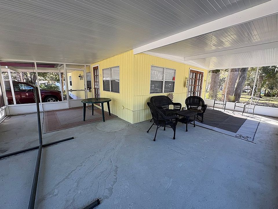 This 1968 home features 1400 sq ft of living space. The kitchen is efficient and offers plenty of storage, newer appliance and a large pantry. The living room is open to the dining room and has double doors out onto the extra-large screened in porch that wraps around the home. Also inside the home is a utility room which is big enough to hold the washer and dryer that are currently in the shed. The master bedroom has plenty of closet space and a ½ bath attached to it. The guest room is well appointed with a large closet. The main bath has been redone with a walk-in shower. You also have 2 driveways, 2 carports and a shed along with an enclosed-out door storage area. Floors are solid and a recent inspection was done on the roof and found to be in great shape. Laminate flooring throughout the home is a big plus and it has been professionally painted inside and out in the last year. This home comes fully furnished and the Golf cart is negotiable. This home could be yours with a reasonable offer as owner must sell asap. Welcome home.