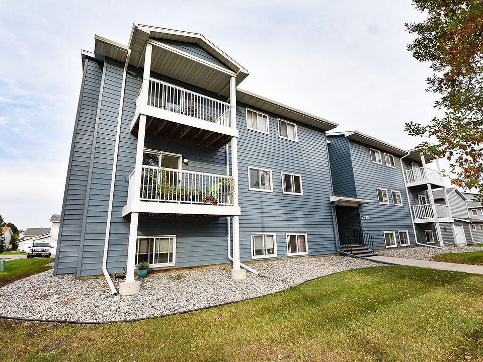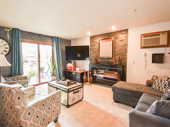 Welcome to this spacious 2-bedroom, 1-bathroom condo in the desirable Bluemont Lakes subdivision. Perfectly situated near parks, trails, and lakes, this home combines comfort with convenience. The inviting living room features a sleek electric fireplace with a stone surround and walk-out access to a private balcony. The kitchen is designed to impress with stainless steel appliances, a tile backsplash, pendant lighting, an eat-up counter, and ample cabinet space. A formal dining room with a built-in bar area, complete with a wine fridge, cabinets, and counter space, makes entertaining easy. Both bedrooms are generously sized, paired with a full bathroom and in-unit laundry for added functionality. Rounding out this property is a detached 2-stall garage, offering plenty of parking and storage.