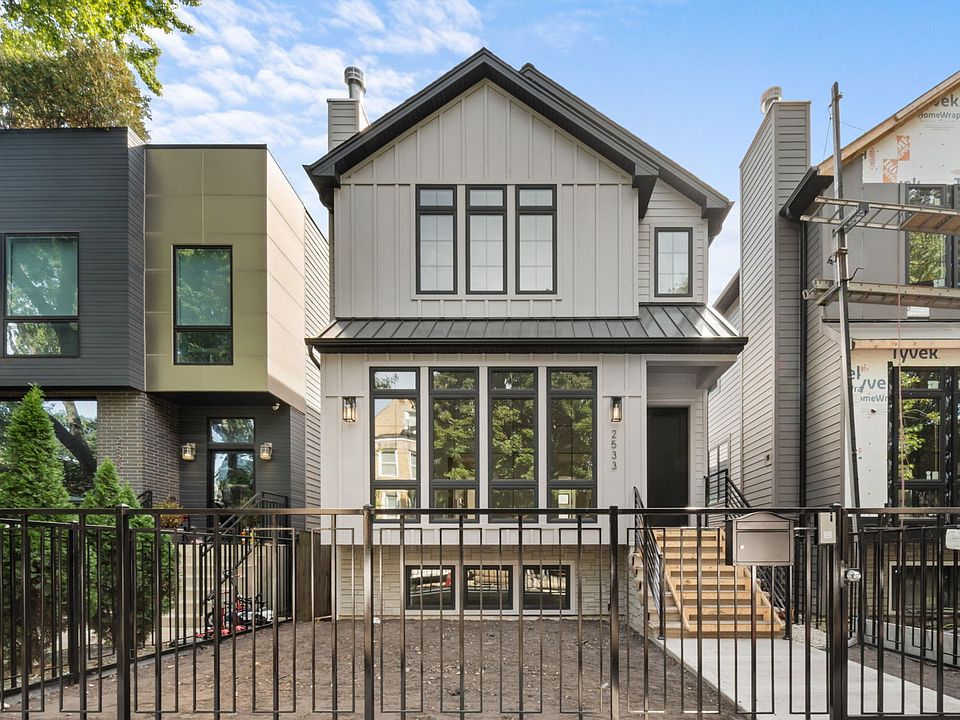 Presenting 2535 W Belden: An extra wide new construction single family home in premier Logan Square pocket. Sitting on a 29' wide lot, the property features 5 bedrooms, 3.1 bathrooms, expansive garage with oversized garage roof deck & bespoke design and finishes throughout. Light filled main level features front facing over sized black on black windows, two fireplaces, oak hardwood flooring, detailed coffered ceiling & wall trim, professional grade kitchen with custom cabinetry, paneled Sub Zero and Thermador appliances, 48" hood vent with matching 48" range top, slab waterfall quartz countertops & over sized island. Open rear entry mud room with south facing exposure, custom built bench, design tile & beautiful wall trim. Top floor features show stopping primary suite with dual walk-in closets, designer primary bathroom with heated floors, floor to ceiling tile, expansive & opulent double vanity, soaking tub & St Regis Spa caliber fixtures. Two oversized additional bedrooms, elegant full second bathroom, laundry room & mechanical room. Lower level features radiant heated flooring, excellent ceiling height, large family room, fully built out wet bar, two additional large bedrooms, third full bathroom, second full laundry room, second mechanical room & tons of storage. Property is located in Goethe elementary school district and is a short walk to the blue line and every imaginable restaurant, shop & yoga studio in both Logan and Bucktown. Very experienced & reputable local developer with late 2025 delivery. Photos shown from a previously built house by the same developer. Show with confidence!