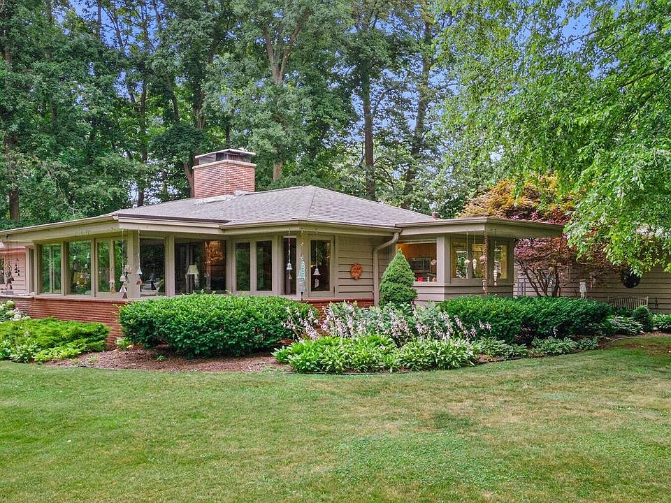 Designed by renowned architect Edgar Tafel, apprentice to Frank Lloyd Wright, this Usonian-style masterpiece blends mid-century design with timeless elegance. Nestled on 1.5 wooded acres, the home features vaulted ceilings, clerestory windows, original Weldtex wood paneling, and built-in cabinetry. A stunning brick fireplace anchors the open concept living and dining areas. The primary suite includes an office, screened porch, and ensuite bath. With iconic design and a deep architectural pedigree, known as the Henry & Gladys Nelsen House, this rare home offers privacy, light, and warmth- an ideal retreat for design enthusiasts and lovers of architectural history. Venture down to the finished LL or head outside where the landscape is as unique and culturally important as the home itself.