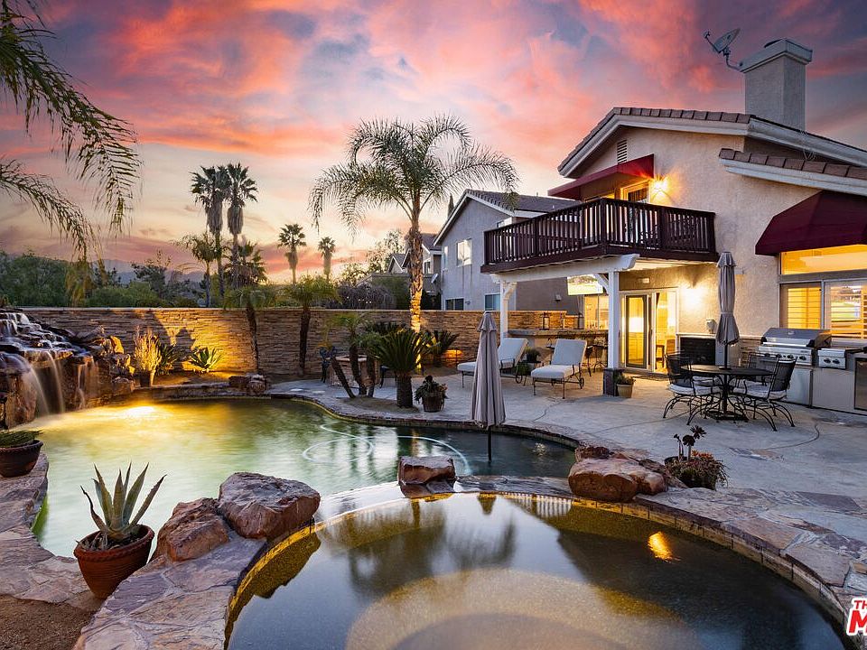 Quite possibly the rarest offering ever in the history of The Arts Tract, this slice of Stevenson Ranch Paradise best embodies year-round modern indoor and outdoor So Cal living at its finest. The seller spared no expense and left no detail undone. Gorgeous curb appeal with stacked stone accents, water fountain and breezeway help this residence stand out amongst other homes. Boasting three bedrooms, three bathrooms (one downstairs bath with a shower) including a downstairs office with a closet that could easily be used as a fourth bedroom. Step into the upgraded family room with high vaulted ceilings featuring crown molding, LED recessed lighting, plantation shutters with a dramatic 74-inch Dimplex Electric Fireplace. Beautifully remodeled kitchen with shaker-style soft close cabinetry, Quartz counter tops, glass tile backsplash and stainless farmhouse sink. Well-appointed stainless-steel appliances include a Sub-Zero refrigerator, Viking Professional Series dishwasher, oven, convection microwave, gas cooktop and hood. The dining area is perfect for hosting family and friends and features an oversized built-in island with wine fridge while conveniently adding additional cabinet space. You won't have to worry about running out of ice when making your favorite libations because this kitchen is equipped with its very own Scotsman - Ice Maker. The backyard is truly an entertainers dream offering stunning mountain views, drought tolerant desert landscape with a stamped concrete hardscape, custom designed pool & spa with flagstone, Pebble Tech Finish, oversized Baja Step and Grotto Waterfall. Outdoor kitchen with BBQ, refrigerator, covered bar w/ kegerator and seating area. Upstairs are three bedrooms including a large primary suite with a deck overlooking the pool and spa. Primary bath featuring a double sink vanity, upgraded travertine shower with built-in seat, frameless shower glass and a spacious walk-in closet. The second and third bedrooms have Jack-And-Jill access. Upgraded downstairs bathroom with travertine tile and frameless shower glass. Inside laundry, attached two-car garage with epoxy coated slab. Located within Stevenson Ranch Award Winning Schools, shops, restaurants and the best SCV has to offer. NO MELLO ROOS, low HOA and easy access to the five freeway.