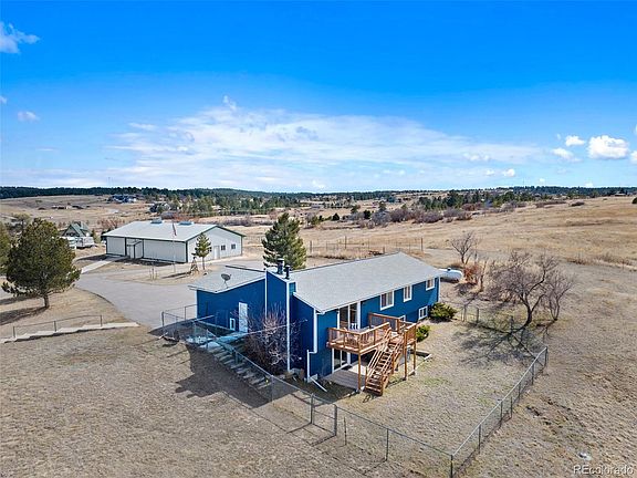 Amazing 10 Acres of horse property fronting on a paved Douglas County highway a short drive Southeast of Parker! Value-priced compared to the competition for expeditious sale! Don't hesitate and miss this one! Nice hilltop 5-bedroom ranch home with finished walk-out basement, completely remodeled and updated 2020-2021! New kitchen features white shaker-style cabinetry, quartz countertops, and complete stainless steel appliance package! New raised deck off the main floor offers great views! Family room in full basement features a small wet bar, entertainment wall, and walk-out to concrete patio with hot tub/spa! 2020 LP gas furnace with electric central air. Newer septic system installed in 2019 and just cleaned and re-inspected in March 2024. Excellent well allows for domestic and livestock watering use. Well permit recites a maximum of 1 acre-foot/year of water consumption (325,851 gallons per year). Amazing 40'X 75' (3,000 SF) clear span, all steel building with concrete floor, complete insulation, 125 Amp 220 Volt power, 12'x12' finished office, 13'x26' storage loft. Horse/livestock barn (750 SF) with 4 stalls, tack room and loft. Machine shed with 5 stalls and storage loft. Loafing shed and small storage shed. Access driveway from Flintwood Road is a private 30' wide by 710' long easement that is deeded with the property. See the property photos, aerial views and Zillow 3D tour...then book your private showing tour! Immediate possession on home all outbuildings and land. Buyer's responsibility to confirm all information.