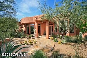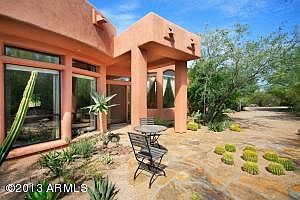 Enjoy the Culture and Lifestyle of Arizona High Desert Living! Four Bedrooms, Three Bathrooms, Three+ Car Garage. Private,secluded setting in this Santa Fe Style home located in Happy Valley Ranch. Exterior is wrapped with patios. Custom Built Home with multiple curving window walls. Beautiful Limestone flooring recently installed throughout the entry, living room, dining room, family room, hallways, two baths & kitchen. Desirable Split Floor Plan. Granite kitchen countertops. New carpet in Master. Architecturally designed backyard Oasis. Huge, South-facing Flagstone back patio provides ideal sun orientation while enjoying the Pebbletec Pool and Spa.Oversized 3+ Car Garage has a vacuum system currently installed for woodworking tools. Great Paradise Valley Schools!