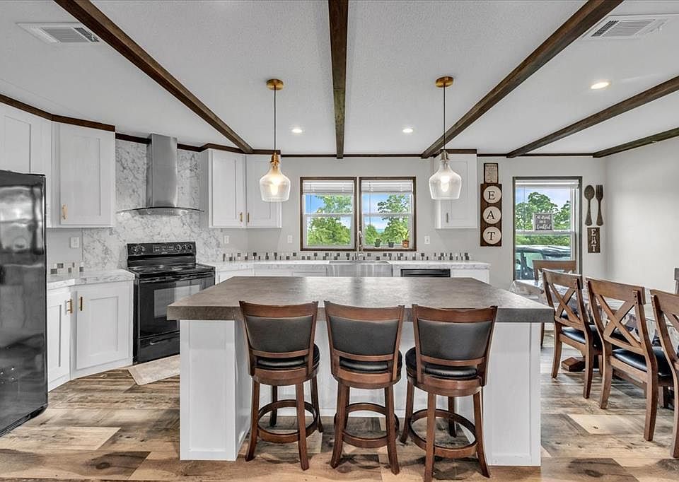 This spacious 4 bedroom, 2 bath home offers two large living areas, a bonus room, and an oversized laundry with sink and mud bench. The open kitchen features a grand island, farmhouse sink, pantry, and generous counter space perfect for entertaining. The dining area easily fits a large farm table, and the living room is accented with rustic wood beams and natural light.