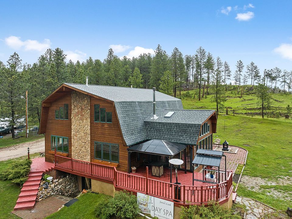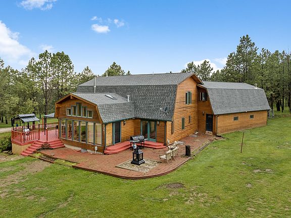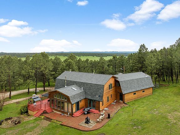 This custom-built home is situated on five acres that directly adjoin 129 acres of Black Hills National Forest on two sides. The barn-style residence features a remarkable sunroom, spacious decks, main-floor living, an open floor plan, a soaring loft and the potential for income, thanks to the absence of restrictive covenants. With two levels and two small cabins, this property is well-suited for use as a VRBO/Airbnb, and the basement, equipped with plumbing for a kitchen, gas connections for a stove, laundry hookups, and a separate entrance, offers the possibility of being a distinct rental/living space. Egress windows have been added to the lower level bedrooms, providing safety and natural light. Abundant storage is available, and the upper level boasts a generous living space above the garage, serving as a non-conforming fourth bedroom. Take note of the expansive oak wood trim & moss rock fireplace. Additionally, two cabins are included in the sale, offering accommodations for income or guests. These modular cabins, currently in the initial stages of remodeling, come with a new 1500-gallon septic system, new electric connections, and hooked-up water supply. The sellers will leave supplies for cabin improvements, such new countertops, cabinets & more. A new driveway and parking area have been constructed, and an electric hookup is available for future gazebo site. Ideal property for chickens, horses and outdoor pursuits.