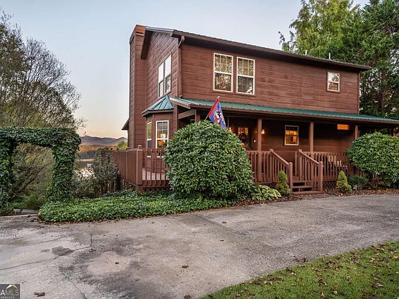 Panoramic lake and mountain views await from this gorgeous log-sided home in the desirable Ran Mar Vista subdivision, known for its spectacular scenery and convenient location close to town. Overlooking beautiful Lake Nottely with a direct view of majestic Brasstown Bald-the highest peak in Georgia-this inviting property blends rustic charm with modern comfort, featuring vaulted ceilings, warm wood floors, and abundant light. The spacious living area offers a cozy gas fireplace and seamless flow into the kitchen with a cooktop, breakfast bar seating, pantry, and generous counter space. A main-level bedroom overlooks both the lake and mountains, with an adjoining full bath complete with a relaxing jetted tub and shower. Upstairs, the open loft serves as a perfect game room or lounge, while the owner's suite offers vaulted ceilings, panoramic mountain and lake views, and a full bath designed for comfort and style. The finished terrace level provides a versatile living area, a room without a window, a full bath, and an unfinished space ready for future use, along with a hobby room and workshop. Outdoor living shines with two ten-foot-wide screened porches, a wrap-around deck, and a beautifully landscaped yard with terraced gardens, fruit trees, and open space for entertaining. On the lower level, a five-person hot tub offers the perfect spot to unwind while taking in amazing views and peaceful surroundings. Additional features include a new roof, heat pump, hot water heater, a detached two-car garage with power, a carport ideal for extra parking or a boat, and thoughtful storage throughout. The home is sold furnished minus personal items and is within walking distance to a public boat ramp for easy lake access. With captivating views of Lake Nottely and Brasstown Bald, comfortable interiors, and impressive updates, this exceptional property offers the perfect opportunity to experience the beauty and lifestyle of North Georgia's mountain and lake region at its finest.