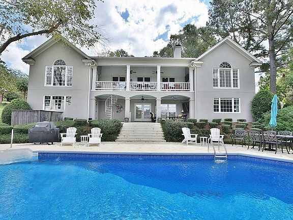 An exceptional waterfront home on Lake Oliver, thoughtfully designed for entertaining and showcasing stunning views alongside a resort-style saltwater pool. Located in the sought-after Green Island Hills community, this elegant residence features 4 bedrooms, 3 full baths, and 2 half baths, enhanced by rich hardwood floors, refined crown molding, plantation shutters, and a beautifully crafted custom kitchen. Multiple living areas and a wet bar create the perfect setting for gatherings. The main level boasts a spacious great room with built-in cabinetry, a fireplace, and an adjoining dining room that opens to a covered patio with breathtaking waterfront views. The updated gourmet kitchen includes a cozy breakfast area, a keeping room with a fireplace, and a convenient half bath for guests. The newly renovated master suite also grants access to the covered patio, offering a private retreat. The lower level provides additional living space, featuring two guest bedrooms, a fitness room or office, a living area with a fireplace, and a full bath. Outside, the entertainment area includes a wet bar and a half bath, perfect for hosting while enjoying the pool. This property boasts 146 feet of pristine water frontage, complete with a brand-new concrete seawall, a boathouse, and a stationary dock. An oversized 2 car garage could accommodate 3 cars and includes a climate-controlled room, ideal for an office or workshop. Don't miss this rare opportunity to own a stunning waterfront home in Green Island Hills!