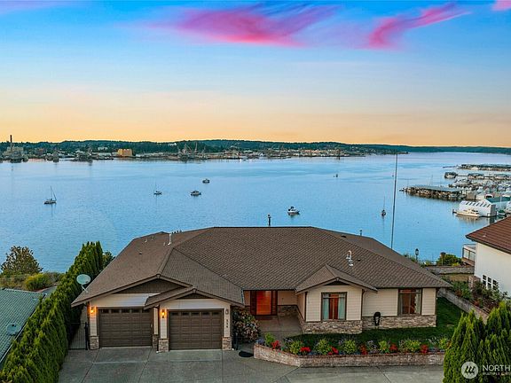 Experience unparalleled luxury in this beautiful view home overlooking Sinclair Inlet. Unobstructed panoramic views of the Puget Sound Naval Shipyard and breathtaking water views fill every room of this 5360sqft estate. Step inside the high ceiling grand entry and bast in the abundant natural lighting. Hand laid hardwood floors walk you throughout this exquisite home, with gourmet chef's kitchen, two master suites, and a leisure area with full service wet bar. This main-level-living home hosts 4 full bedrooms and 4 bathrooms. Additionally, the walkout lower-level leads to an expansive private patio. This home is perfectly designed for both sophisticated entertaining and serene relaxation. Experience this must view property today!