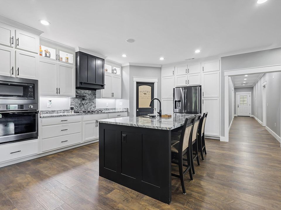 The main-level master suite is a true retreat, featuring a tray ceiling, a stylish accent wall, and a spacious walk-in closet. Pamper yourself in the enormous en-suite bathroom with a luxurious walk-in shower, separated dual vanities, and elegant finishes throughout. The heart of the home is the chef's kitchen, thoughtfully designed with high-end appliances, custom built-ins, a large center island, and a walk-in pantry. Enjoy meals in the formal dining room, perfect for entertaining. Relax in the expansive living room, where a propane gas log fireplace serves as the stunning focal point, enhanced by soaring ceilings and an open concept design. Surround sound wiring throughout the home elevates your audio experience. The main-level laundry room offers convenience, while the wraparound porch invites you to soak in sunrise coffee or unwind with breathtaking sunsets over the rolling landscape. Hidden treasures include a secret gun room and a built-in tornado shelter for added peace of mind.