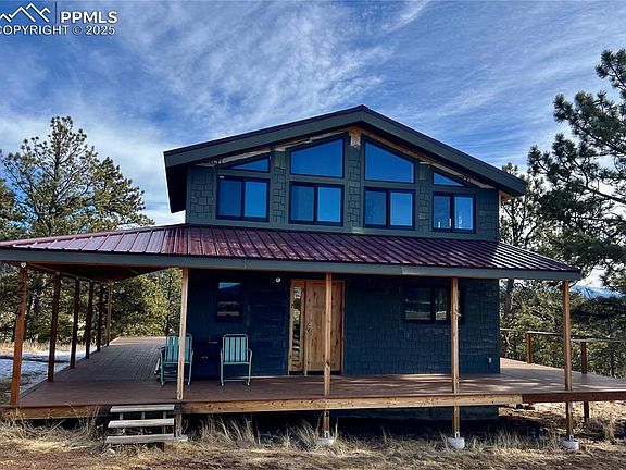 Welcome to this charming mountain retreat, nestled on 7.53 acres at the end of a private cul-de-sac. Enjoy breathtaking views of Pikes Peak and the surrounding Rocky Mountains from the expansive 1,350 sq. ft. wraparound deck. This property offers incredible features, including a spacious 39’ x 29’ insulated garage with storage rooms and a workshop. A separate bathhouse provides additional convenience with a shower, restrooms, and a washer and dryer. Additionally, a cozy one-bedroom cabin, complete with a kitchen, bathroom, and living room heated by a wood stove, adds to the property’s appeal. With rolling meadows, peaceful forests, and abundant wildlife like deer and elk, this property is a nature lover’s paradise. Whether you’re looking for a private getaway or the perfect place to build your dream home, this unique opportunity awaits! This property includes a brand new well pump with a backup cistern.