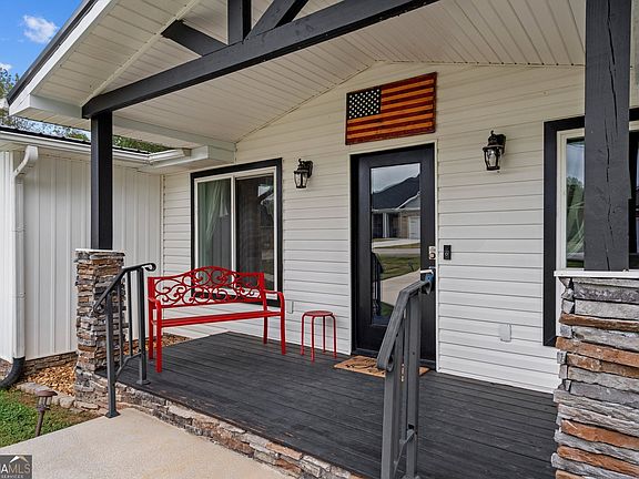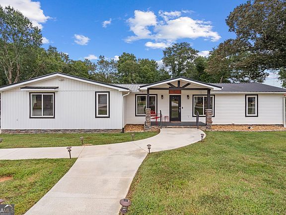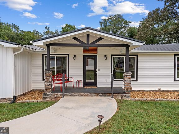 Welcome to this stunning renovated 4-bedroom, 3-bath residence, expertly blending modern farmhouse style with warm, comfortable elegance. Nestled on 2+-acres, this home features a sleek metal roof and an inviting covered front porch with stone columns. Having undergone a comprehensive renovation two years ago, this home showcases an open and airy layout with an abundance of natural light, large slider windows, and tasteful finishes throughout. The oversized carport provides ample space for vehicles, an RV, or additional storage. The primary retreat features a spacious marble-tiled shower with dual shower heads, a large modern free-style soaking tub, and dual vanities. With spacious closets throughout. Step into the beautifully renovated kitchen, which is sure to impress! Featuring sleek white shaker cabinets, striking black granite countertops, a full-height backsplash with stainless steel appliances, this space seamlessly blends elegance with functionality. The built-in microwave, smooth-top range, and double-basin undermount sink make cooking a breeze, while modern lighting and stylish hardware add a sophisticated touch. The open layout flows seamlessly into the dining area, making it ideal for entertaining or hosting family gatherings. With its rich hardwood-style flooring and thoughtfully designed layout, this kitchen is both a showstopper and a chef's dream. You will find a large walk-in laundry room, along with a split bedroom floor plan. Bathrooms feature marble tile flooring and a tile-surround deep-soaker tub. Expansive Covered Porch offering Outdoor Living at Its Finest! Enjoy year-round relaxation and entertaining on this stunning covered back porch, designed for comfort and connection with nature. This expansive space features beautiful natural wood decking, ceiling fans for a cool breeze, and ample room for dining and lounging. With serene views of a private, tree-lined backyard, it's the perfect setting for morning coffee, evening gatherings, or weekend barbecues. A built-in bench offers additional seating. Whether you're hosting a crowd or simply enjoying a quiet evening, this outdoor retreat is sure to be a favorite spot in the home. Enjoy listening to the band from Bowdon High School or a Friday night game within walking distance to this home. Ideally located, just minutes from local shops, schools, and amenities, this move-in-ready gem is one to view today. Storage building remains.
