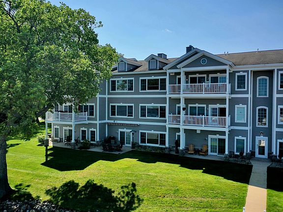 Luxurious, 3 bedroom, 3 bath, 2100 square foot main floor condominium in the Lake Mitchell condo association. This main level, walkout end unit features characteristic trayed ceilings, warm wood floors, quartz countertops and a large island kitchen. One end of the unit is home to the master suite with doors to a private patio area, private bath with walk-in tile shower, and a walk-in closet. The opposite end has another private suite with private bath, and also walks out to a patio area. The finished garage with epoxy floor is directly across from the door to enter this unit, making it convenient and barrier free. The property offers 410 feet of Lake Mitchell frontage to enjoy, and comes with a boat slip. Directly across the road is the historic Cadillac Country Club golf course.