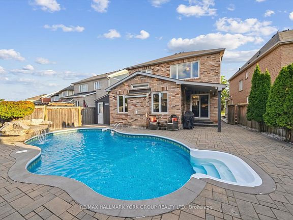 Welcome to this beautifully upgraded executive residence on a premium pie-shaped lot, showcasing fabulous curb appeal with an all-brick and stone facade, outside potlights and an interlocked driveway. Inside, engineered wide-plank hardwood floors flow through complemented by smooth ceilings on the main and second floor, elegant crown moulding with LED lighting, and a striking feature wall. The gourmet kitchen is a chef's dream, featuring stainless steel appliances and granite counters. Convenient main-floor laundry offers direct entry from the garage. An oak staircase with wrought-iron railings leads to the second floor, where you'll find four spacious bedrooms, including a luxurious primary suite with a walk-in closet and a 5-piece ensuite bath, plus an additional full 4-piece bathroom. The finished basement expands your living space with a kitchenette, 3-piece washroom, an extra room, a rec area and ample storage. Step outside to your private backyard oasis: a heated saltwater pool with a cascading waterfall, a 2-piece seasonal bathroom, cabana, pergola, and interlocking stonework. A dedicated mechanical room houses the pools pump, and heater for easy maintenance.This exceptional property blends luxury finishes, thoughtful upgrades, and resort-style bakyard perfect for entertaining and everyday living.