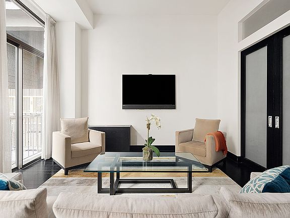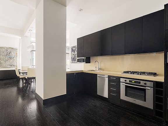 Inside this 1,235-square-foot showplace, beamed ceilings dotted with recessed lighting and speakers rise 13 feet high over wide-plank hardwood floors and floor-to-ceiling windows facing the building’s peaceful courtyard. A gracious foyer with a roomy coat closet opens to the sleek open kitchen, where custom cabinetry and thick slab countertops surround stainless steel appliances, including a gas cooktop, dishwasher, and built-in microwave. Plan your next dinner party under a crystal chandelier in the adjacent dining area or stretch out and relax in the spacious living room.