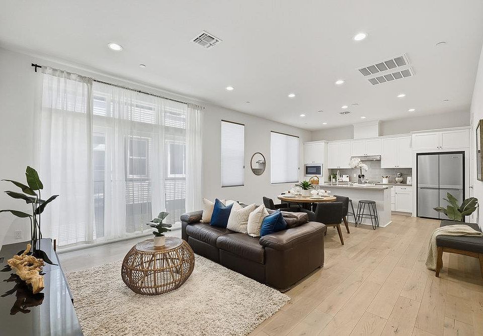 Contemporary elegance defines this immaculate 2-bedroom, 2.5-bath, 1,301 SF award-winning townhome built in 2019, magnificently designed with refined modernity. Ascend to the expansive main living area with soaring ceilings, gleaming oak floors, recessed lighting, and oversized windows that fill the home with natural light. The chef's kitchen showcases high-end appliances, beautifully contrasted quartz countertops, custom white cabinetry, a walk-in pantry, stylish backsplash, and an oversized island flowing seamlessly into spacious dining and living areas, perfect for entertaining or everyday elevated living. Each bedroom is a private retreat with luxuriously appointed en-suite baths and custom-shelved closets. The primary suite is a light-filled sanctuary with soaring ceilings, a spacious walk-in closet, and a double vanity spa-like bath. Added conveniences include entry level powder room, attached 1-car garage, temp-controlled RO filtration, water softener, central heating & AC, Ring doorbell, in-unit washer/dryer, and an exceptional location near vibrant downtown, San Pedro Square, beloved restaurants, SAP Center, Pellier and Bassett Parks, major tech campuses, Caltrain and highways 880, 87, 101, and 280. Experience modern luxury in one of SJ's most desirable neighborhoods!