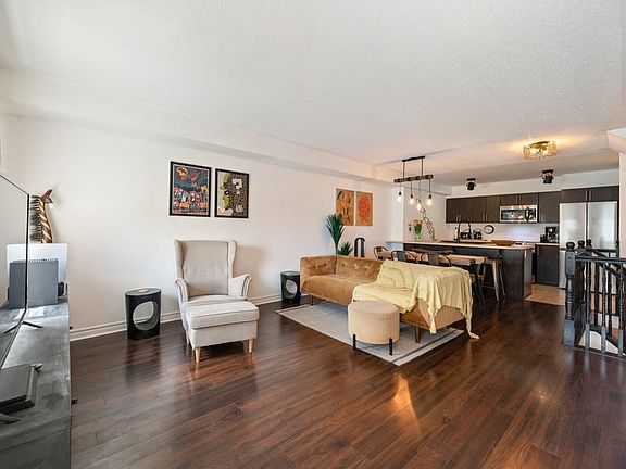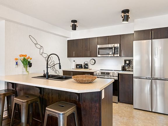 Open-concept main floorLarge windowsElegant laminate flooringModern kitchenHigh-end stainless steel appliancesConvenient breakfast barOversized entryway closet