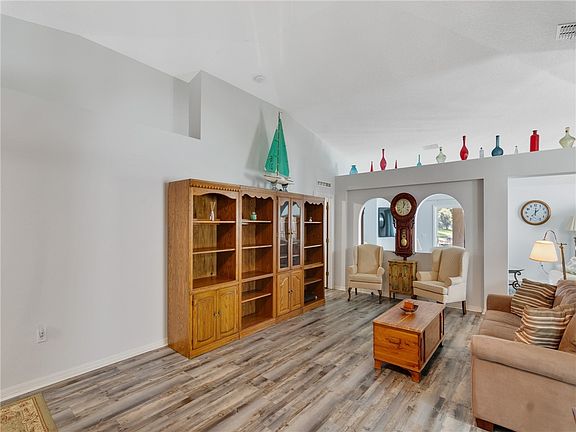 Spacious and bright lakefront home with a 2024 roof & gutters, 2021 AC, LVP flooring, exterior painted 2021, cathedral ceilings, and a huge lakefront porch to enjoy your mornings and BBQ dinners. This wonderful gated community has a beautiful pool, basketball court, playground, sidewalks for evening strolls and meeting neighbors. The split floor plan offers a combo living/dining room area, plus a large family room/TV area, a generous master suite with en-suite bath, and the two guest BRs and bath are set away. The south facing yard is just beautiful, and Low HOA dues cover lawn care, too!